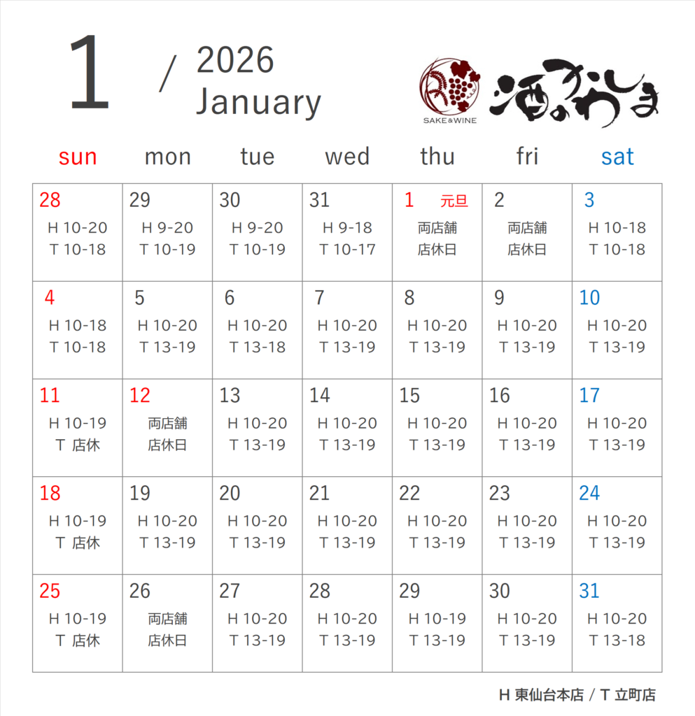 お休みのお知らせ 今月の店休日はこちらです 2026年1月のお休み東仙台本店元旦、2日、12日、26日※29日閉店時間変更有り立町店元旦、2日、11日、12日、18日、25日、26日※6日、31日閉店時間変更有り
